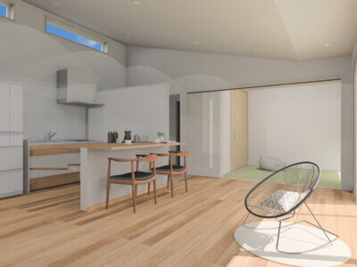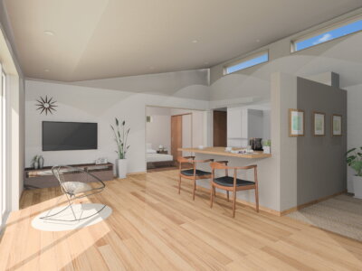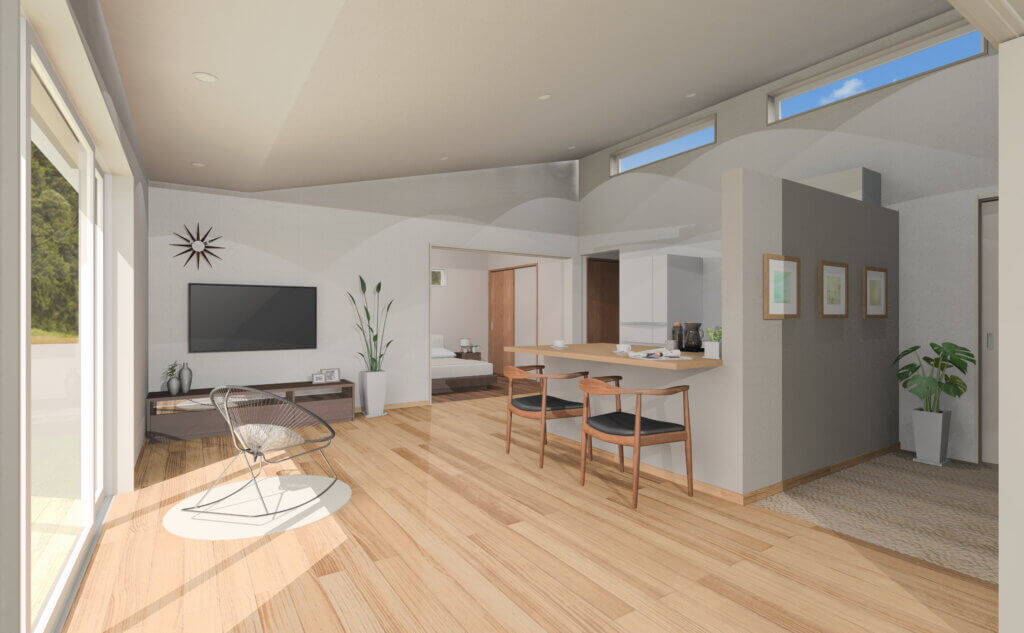 平屋ならではの暮らしやすさに、勾配天井の開放感を取り入れた住まいです。