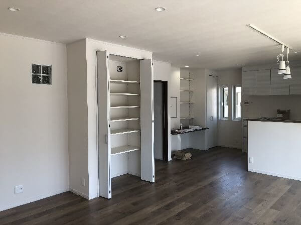 22帖の広いリビングには真ん中に収納を配置して、オモチャも収納可能です。
