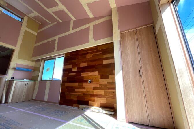 クロスはこれからですが、すでに「シダージュ」という内壁装飾材が貼られました。