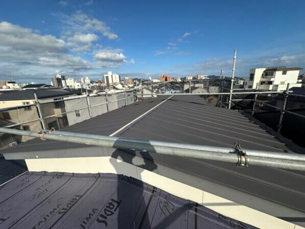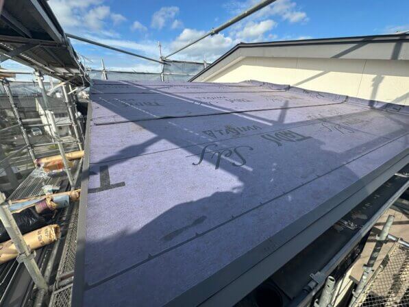 下の写真は既存屋根のシングル葺きの上に防水処理をしたのちGL鋼板の重ね葺きをしている写真です。